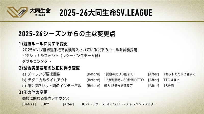 2025-26 大同生命SV.LEAGUEの競技運営における主な変更点についてお知らせします。