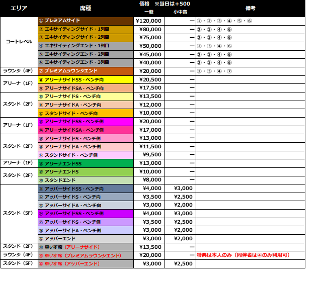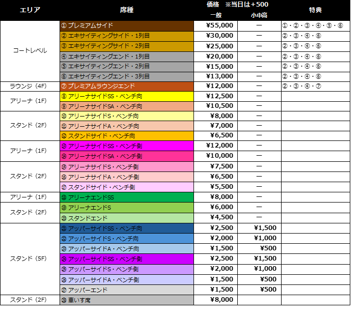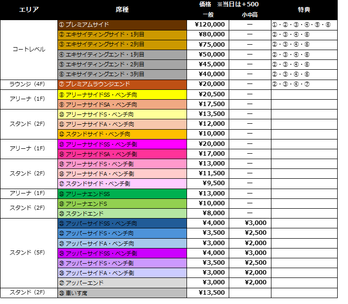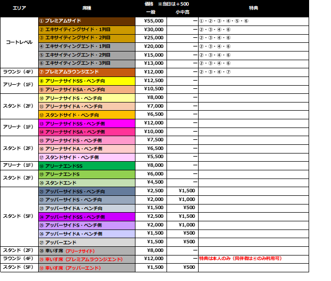 ※ベンチ付近のお座席は、チームベンチやウォームアップエリア等により、コート内が見えにくくなる場合がございます。予めご了承のうえ、お買い求めください。