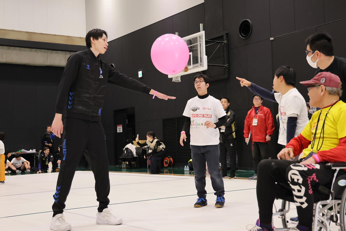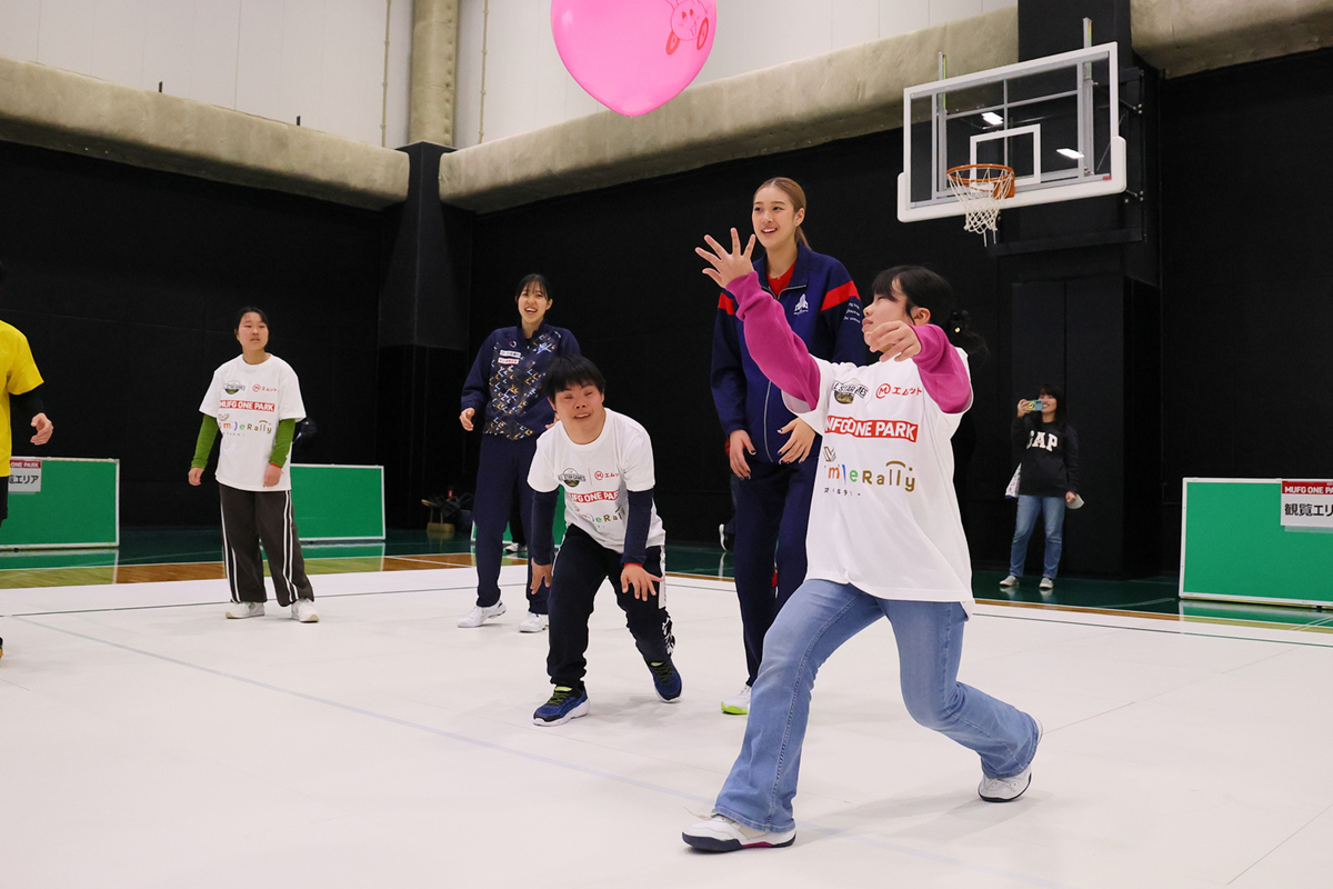ふうせんバレーボールは、障がいの有無に関わらず、子どもから高齢者まで、誰もが一緒に楽しめるように考案されたバレーボール形式のスポーツです。選手たちも初めて体験するふうせんバレーボールに興味津々。いつもとは違うふうせんボールの感覚に戸惑いながらも、自然と笑顔がこぼれ、声を掛け合いながらプレーを楽しむ姿が見られました。障がいや年齢の違いを越えて、温かな雰囲気に包まれるひとときとなりました。